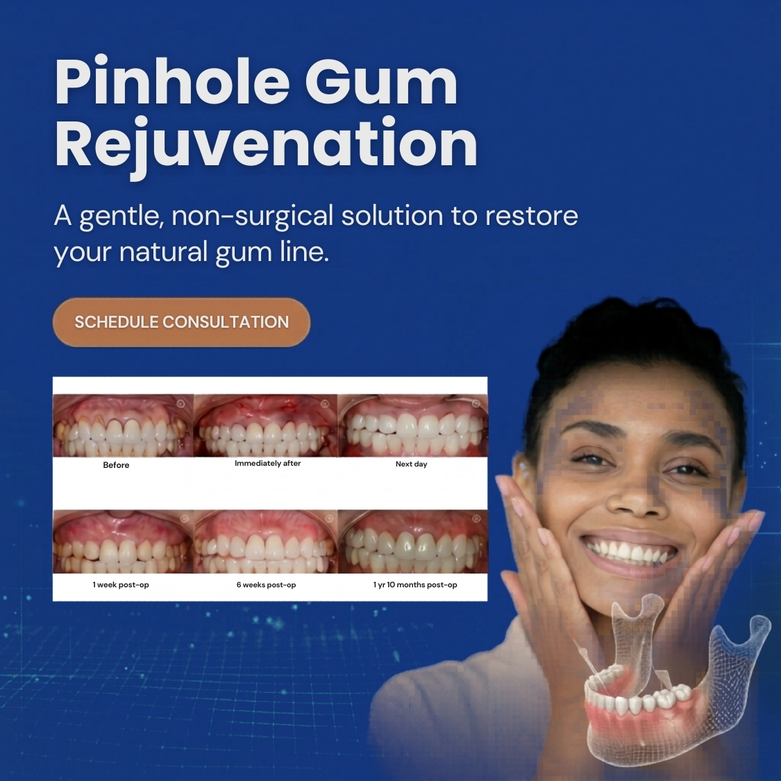 Restore receding gums with a minimally invasive treatment that gently rebuilds your gum line without traditional surgery. Enjoy a healthier, more natural-looking smile with minimal discomfort and faster recovery.